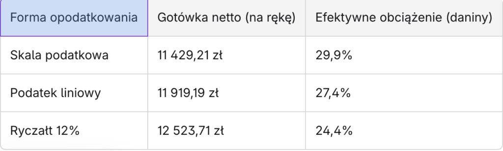 W tym konkretnym przypadku ryczałt wygrywa, bo przy niskich kosztach operacyjnych płacenie podatku od przychodu jest korzystniejsze. Jednak dla kogoś z wysokimi kosztami, ten sam wybór nie byłby najkorzystniejszym rozwiązaniem i przypadku skali podatkowej mógłby on zyskać więcej.